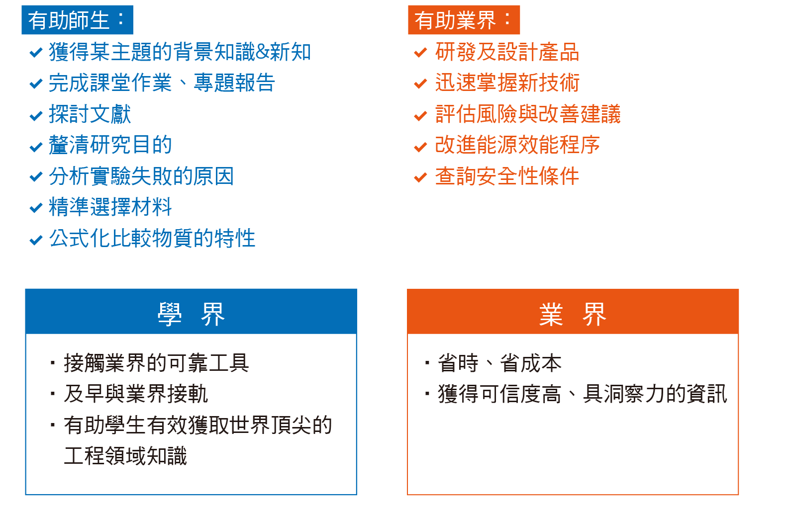 Knovel的方程式常應用於:航太&雷達科技、膠體化學、色層分析、流體動力學、電力工程、電子學&半導體、熱力學……等。